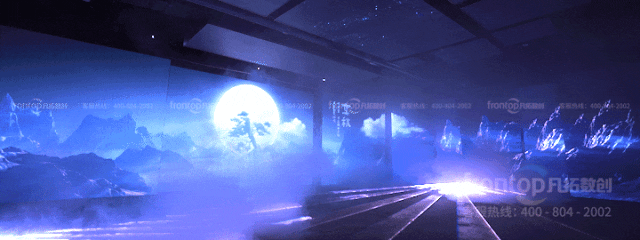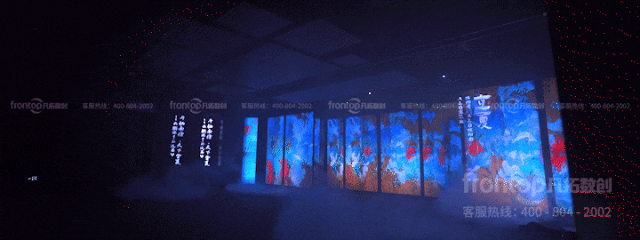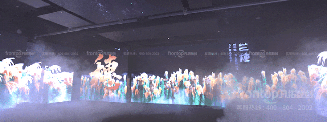 我们在展厅的设计上运用了多种媒体联动的创作手段,在262平米的展厅内共用了145平米的LED屏,通过对纱幕投影、激光灯、雾幕等多种常见技术与设备进行协调组合,营造出虚实结合的梦幻感。