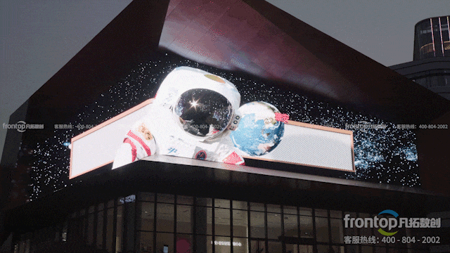 凡拓数创针对特殊的屏幕条件打磨最适合的3D创意方案,充分利用狭长的屏幕空间弥补上下间距的限制,通过横向运动的飞船和宇航员,实现呼之欲出的裸眼3D效果,打造大屏成为展馆亮点及市民打卡圣地。