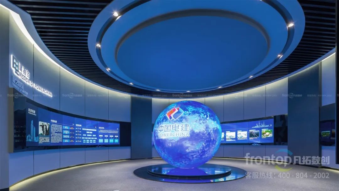 全球品牌展示区,通过球幕结合数字展墙的立体视效组合生动展现中国电建集团的品牌综合实力。