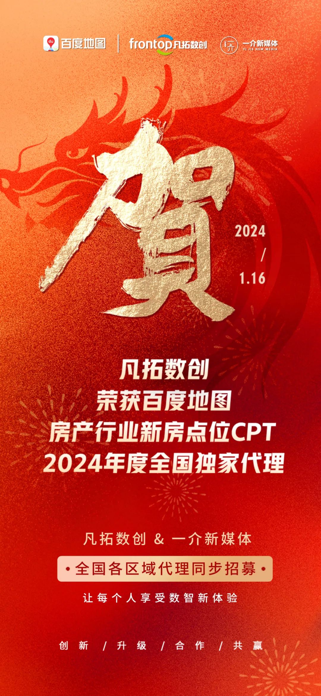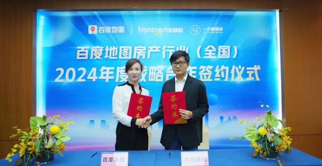 1月16日,百度与凡拓数创地产新媒体业务控股子公司一介正式签订百度地图房产行业新房点位CPT全国独家代理合作协议。基于百度地图在全国范围内的智能交通基建优势,双方就百度地图的“百度新房通”产品方向开展深度合作,引入凡拓数创AI3D数字孪生技术,助力百度地图构建房产板块新生态,在地产行业深度调整时期献上精准营销必杀技。