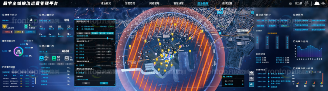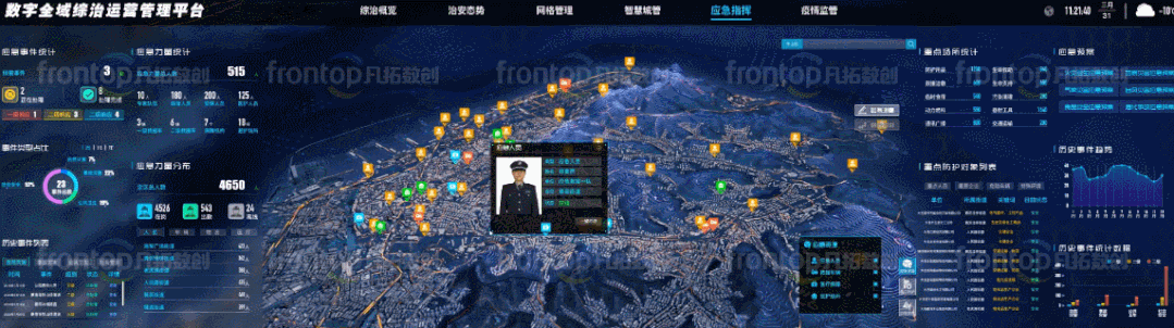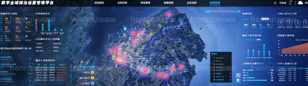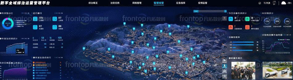 针对当下痛点,凡拓数创城市综合治理数字孪生IOC解决方案通过建立孪生城市,对城市进行全要素管理,从宏观、微观、多维、立体等不同角度展示城市运行情况,使城市管理者能够全面准确的掌握城市运行动态实现“一图掌握全局”。