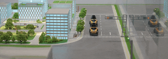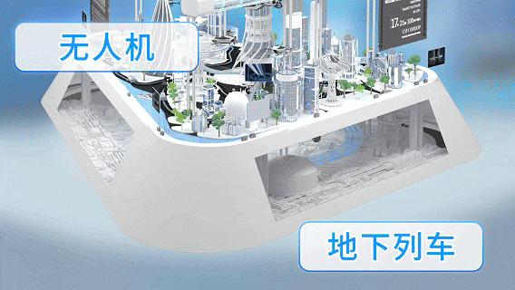 具象化呈现了繁华市区、工业园区、生活社区中,车辆与道路设施、行人,通过智能网联汽车技术实现的通行效率、便利性提升与安全保障。