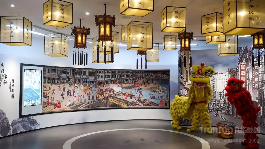 标志着非遗名称的古灯下,两只威武的狮子伫立。52个非物质文化遗产长幅画卷在空间中舒展开,随点展开远久流传的民俗活动、非遗项目讲解,数字展示技术配合推拉屏,让历史长卷变得鲜活生动、通俗易懂。