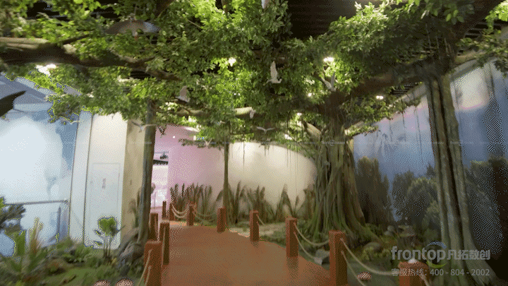 馆内造景还原出了这一万千灵鸟欢叫,翩翩起舞的奇观。一群白鹭盘旋向上,直往二楼小鸟天堂奔去,再现万鸟盘旋归巢的壮观美景。以鸟喻人,江门华侨也如一群思乡的鹭鸟,历尽艰辛也要启程回到永久的家乡。