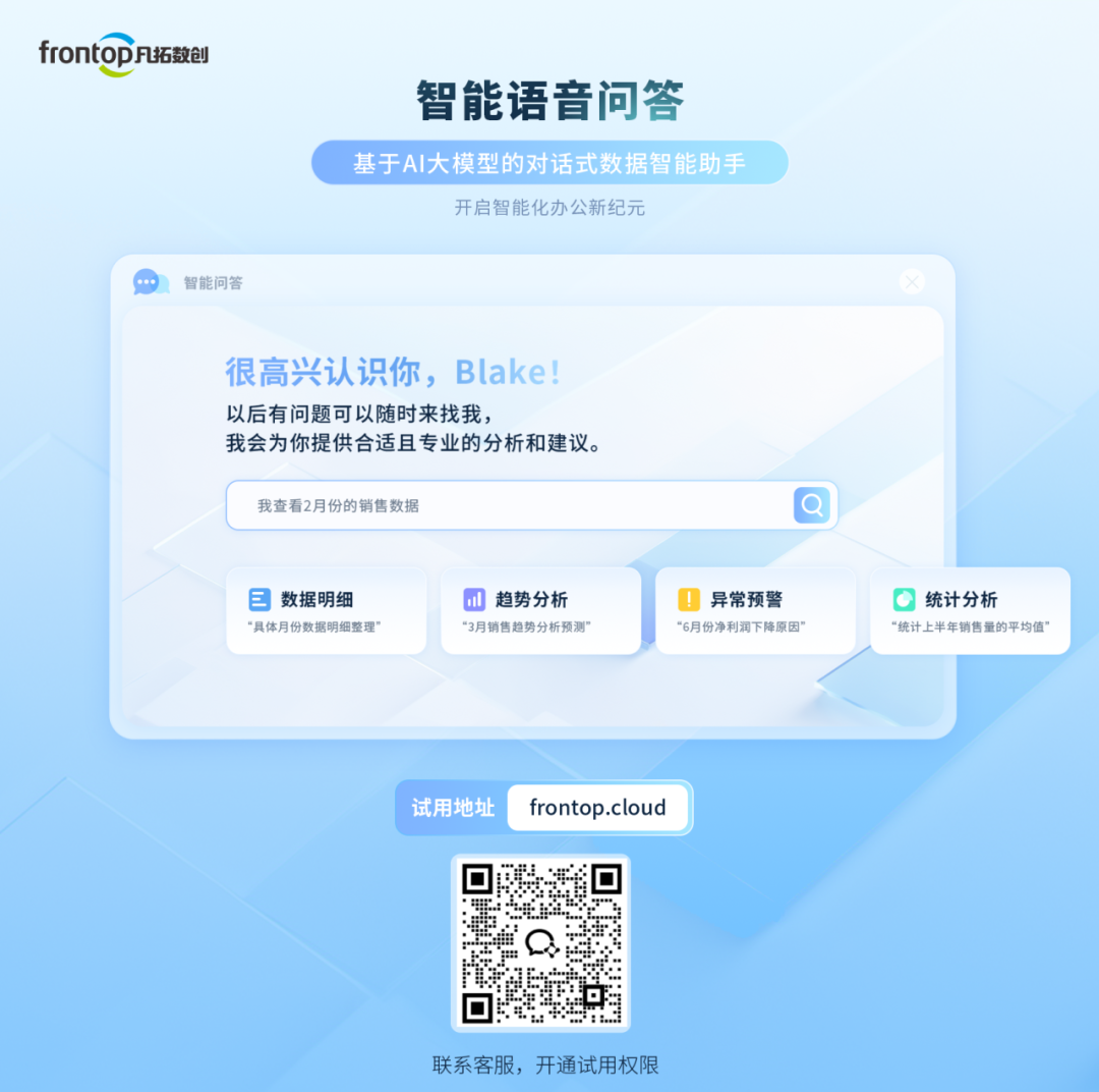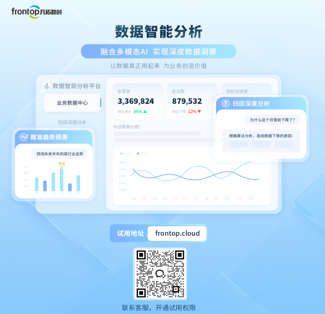 将AI模型集成到凡拓ChatBI底层架构中,让产品更准确理解用户提出的数据分析需求,即便是语句结构复杂、语义模糊的提问都能准确捕捉用户意图,自动识别业务指令,生成图表、分析报告及数据洞察。