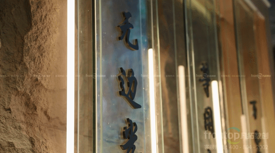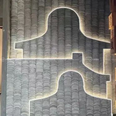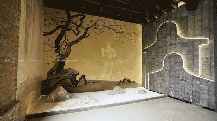 两侧文化石结合波浪造型与中央流水屏互相辉映,营造“高山流水”意象,烘托出朱熹诗词所传达的理学大家精气神。