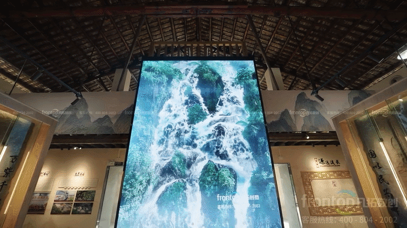 展厅的核心区域为由房顶木梁垂下的L屏流水幕,循环播放理学文字与流水的主题动画,契合朱熹的理念“为有源头活水来”,抽象与具象相结合的表达方式,寓意理学知识如源源不断的活水从二楼的藏书阁流向展厅。