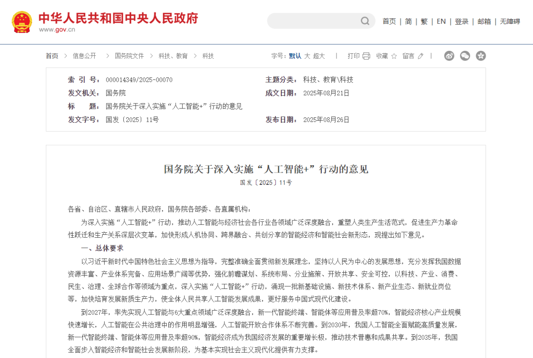 近日,国务院印发《关于深入实施“人工智能+”行动的意见》(以下简称“意见”),提出加快实施6大重点行动,推动人工智能与经济社会各行业各领域广泛深度融合。