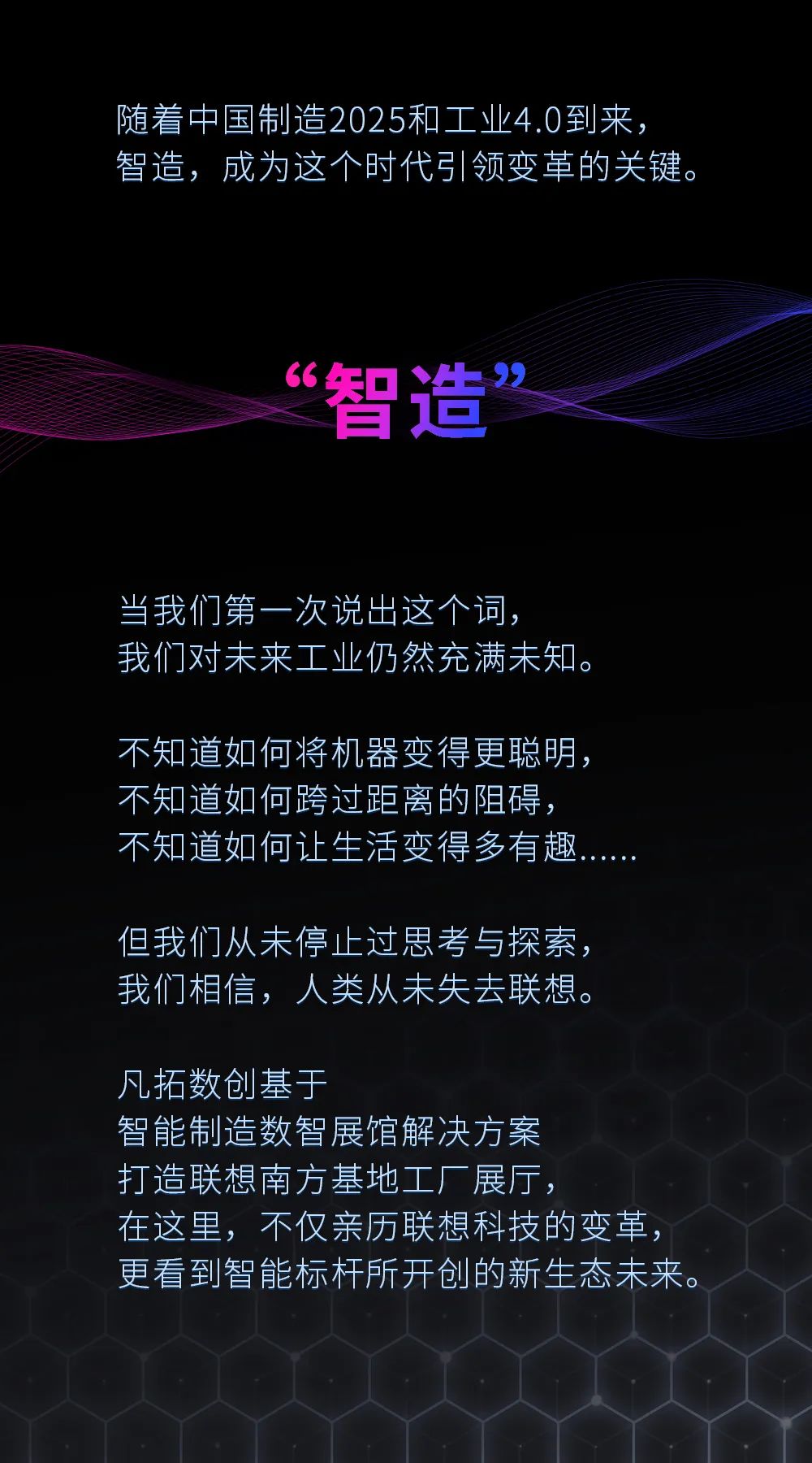 凡拓数创团队为联想南方基地量身策划“联想智造,让智能被看见”主题,打造5大展区19个数字展项,以智造科技为基础,将创意融入产品展示,解决“将联想的智造信息精准传达”的核心诉求。