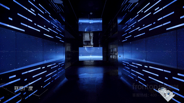“联想广度”展区,三屏联动的联想未来时光隧道具有强烈纵伸感,步入展厅,从宏观的现实世界过渡进入未来,视线被尽头的数据流吸引,光线慢慢勾勒出能量的原子球,传递联想“善用科技创新的力量打造未来”的核心理念。