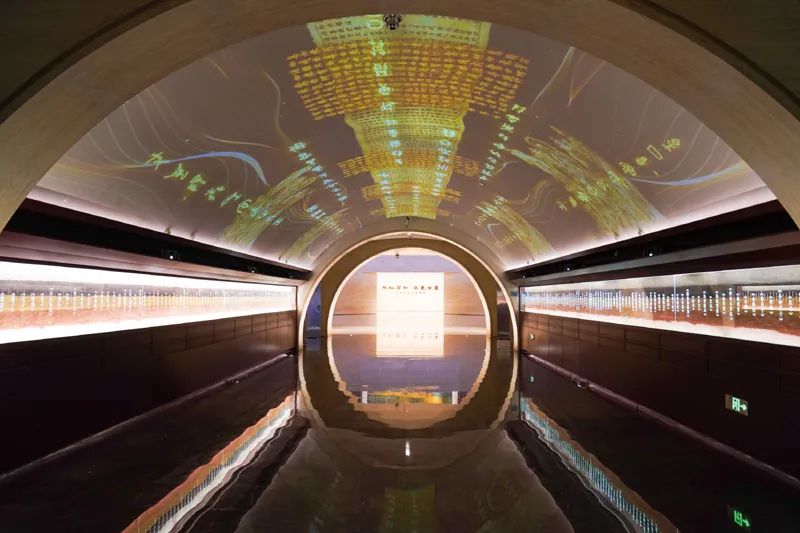 “文以载道”裸眼3D时空廊道两侧是象征着中华大地的五色土,阅览两侧百本影响中华文明的典籍,寓意读万卷书,行万里路。头顶由十种重要版本形态演绎的天空,观众仿如置身历史时空中,感受版本在中华文明发展中的重要承载作用。