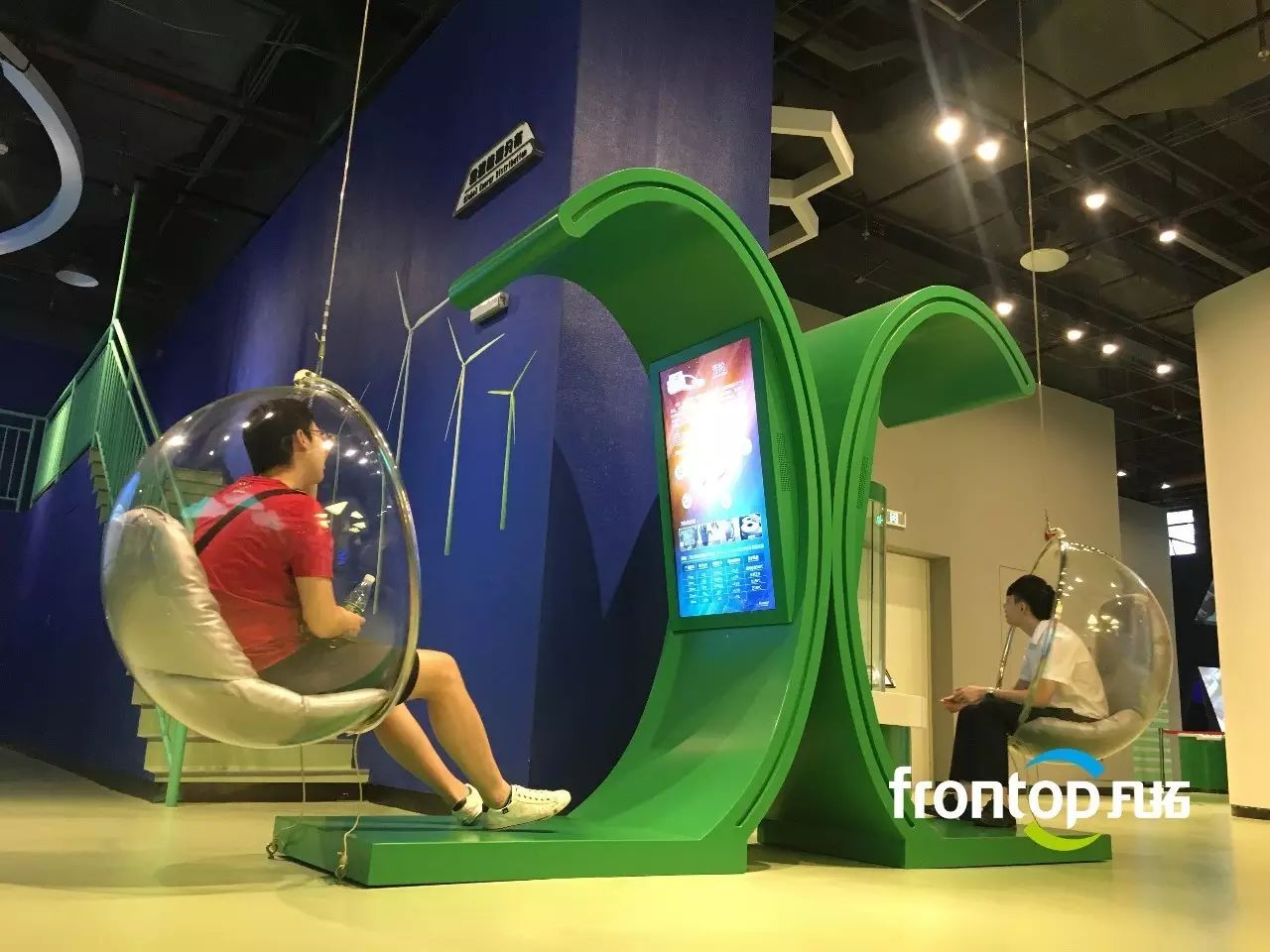 蓝色吊顶下,悬挂着一组由792个小球构件组成的音乐球阵。伴随着绚丽的音乐和灯光,小球构件将在计算机的控制下进行上下移动,演示出100多个动态造型。