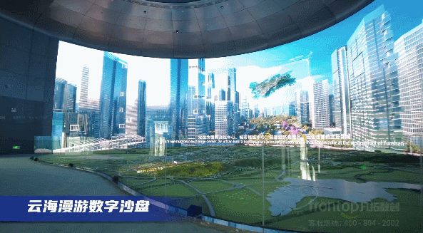 云海漫游区域,大型多媒体数字沙盘围合成沉浸式数字影院,以震撼的光影秀开场,三维影像叙述白云区产业规划的恢弘篇章。