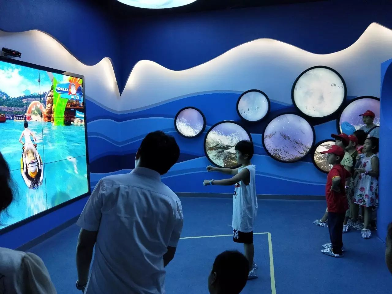 地幕投影画面设置为鱼儿畅游、海草摆动的海底场景,参观者通过感应系统踩踏互动地面,会在脚底生成水纹、驱赶鱼群、冒水泡的互动特效。