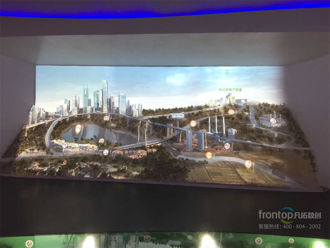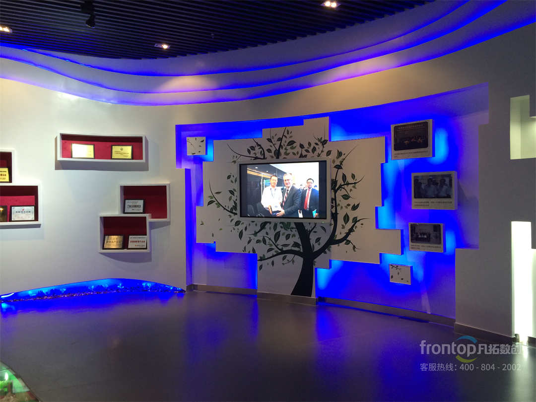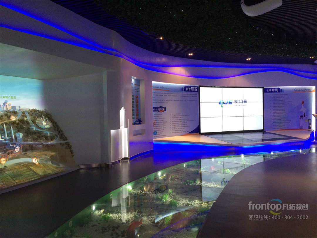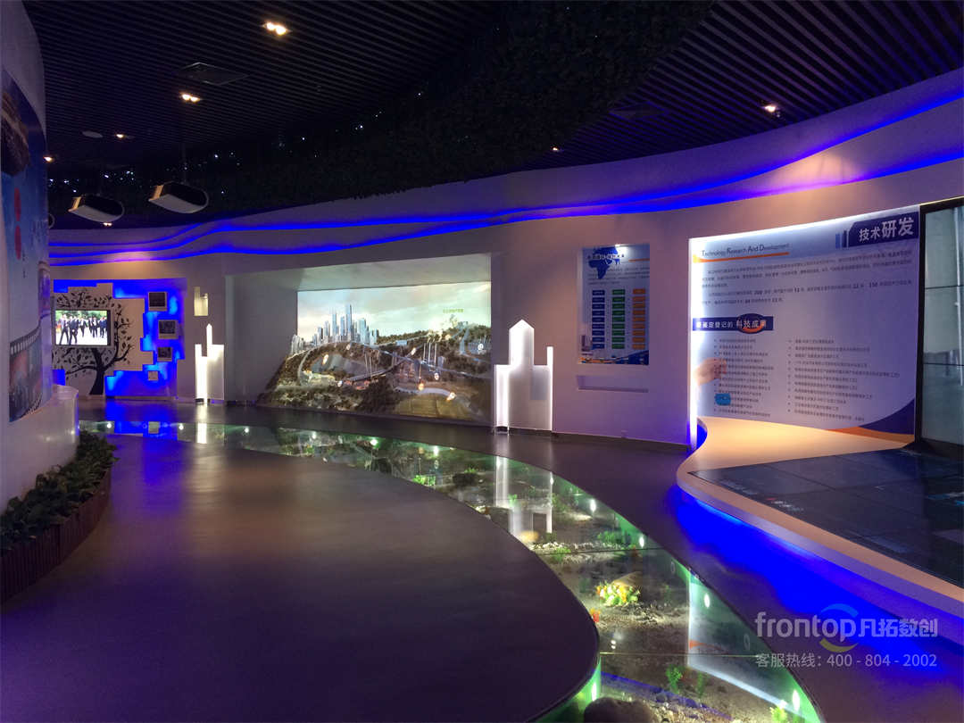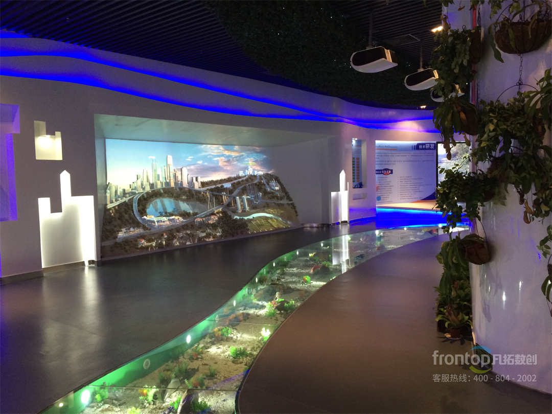 东江环保企业总部展馆,实用面积达500平米,基于项目展示内容信息量比较多,又对产品生产流程的理解与发掘,设计师们利用简单弧形空间形态与生动的多媒体数字化展示手段来达到一种体验感,无限延伸的空间的大小与虚拟互动化,创造更大的展示数据库,而为了呼应生态环保的主题,地面与天花创造了一条数字化长河,通过数字投影,使河上出现动态影像,更加奇特与生动,带领参观者进行一种身临其境的游览体验。
